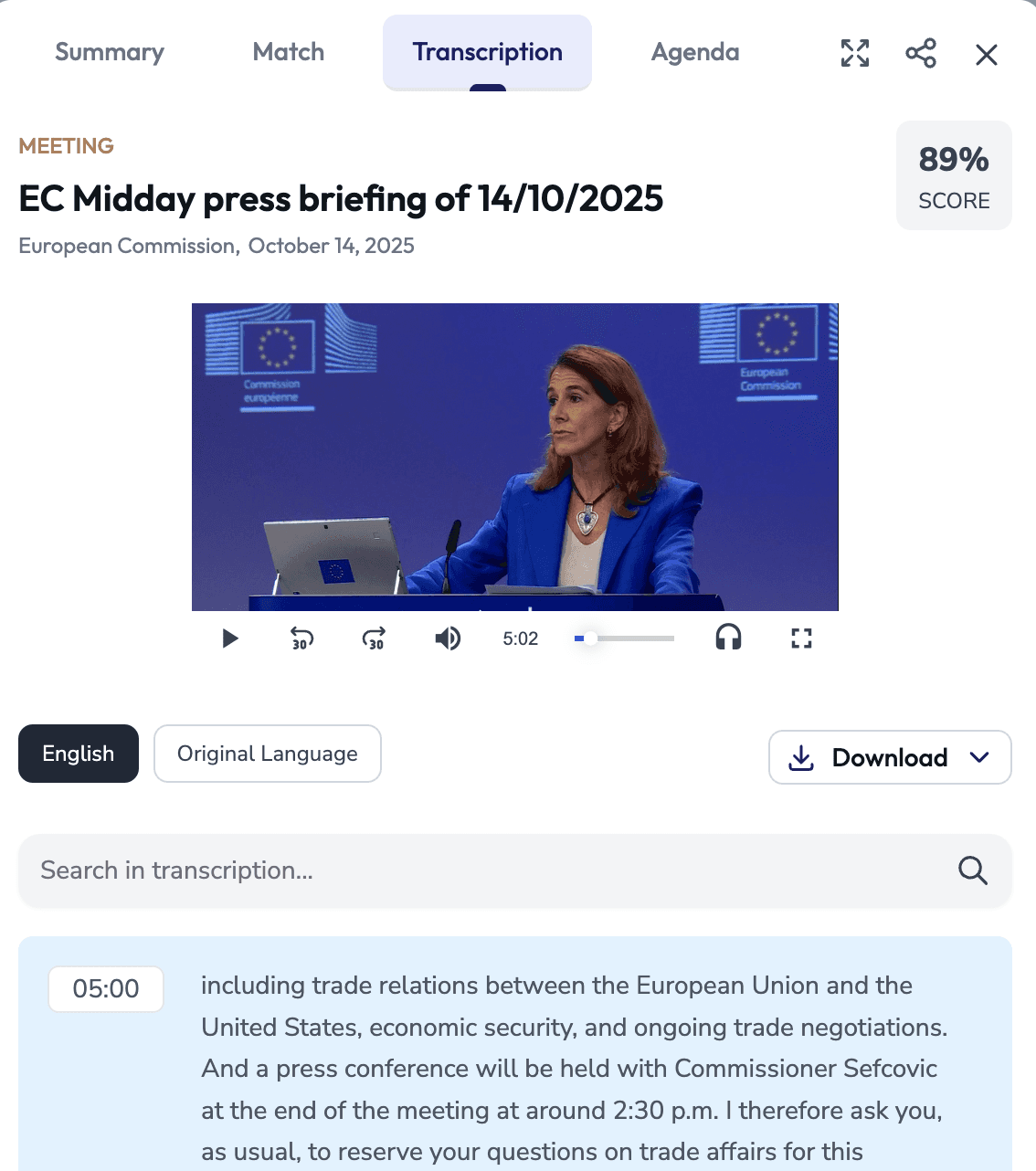 Audiovisual policy data is extremely time consuming to process. With our Research Agent, you can easily analyse policy debates across multiple political levels